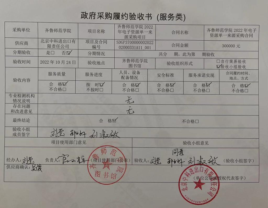 齐鲁师范学院 2022年电子资源单一来源采购项目项目验收报告