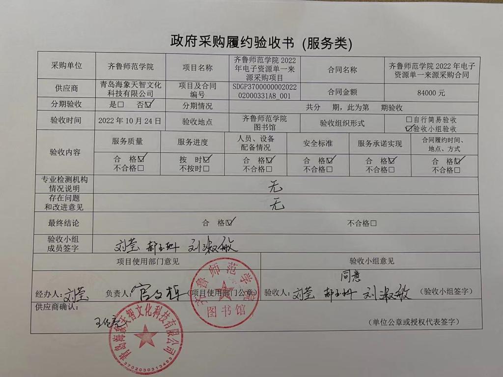齐鲁师范学院 2022年电子资源单一来源采购项目A7项目验收报告公示
