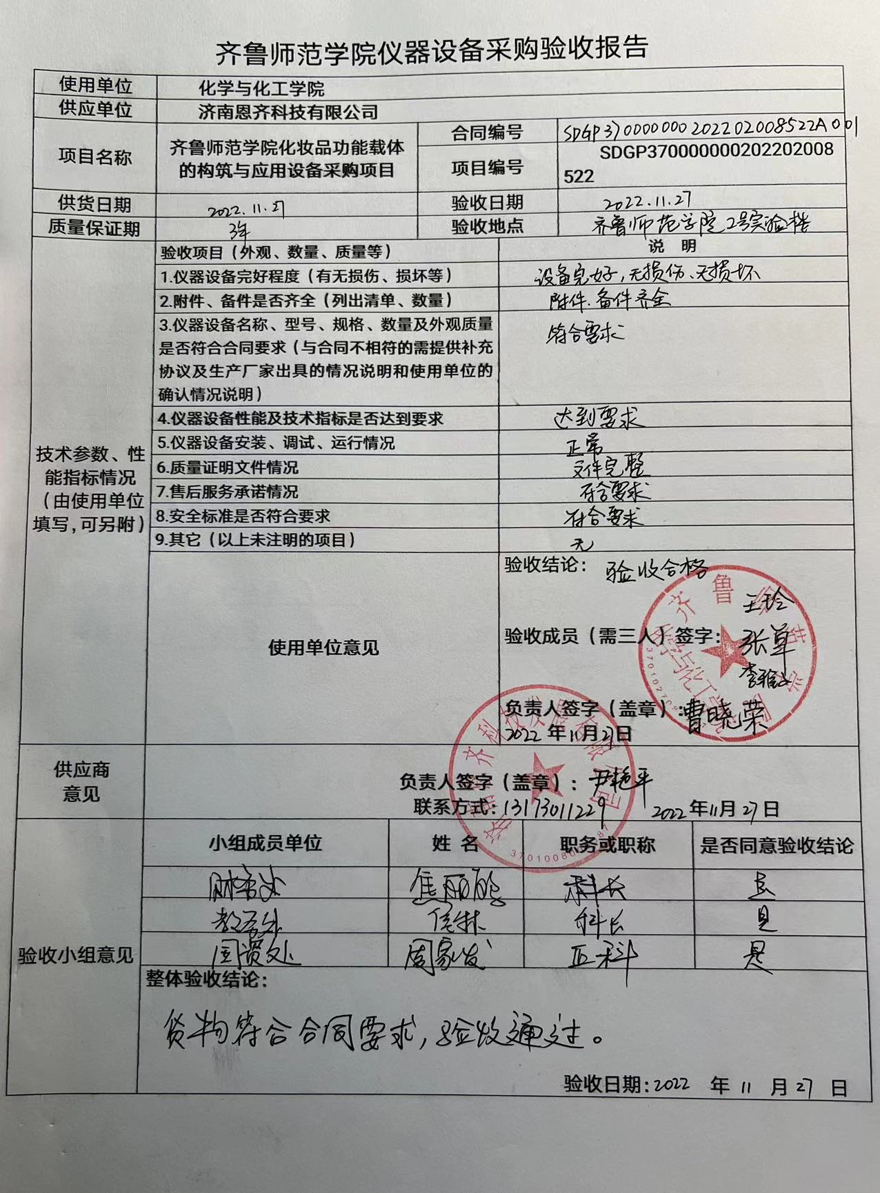 齐鲁师范学院化妆品功能载体的构筑与应用设备采购项目项目验收报告公示